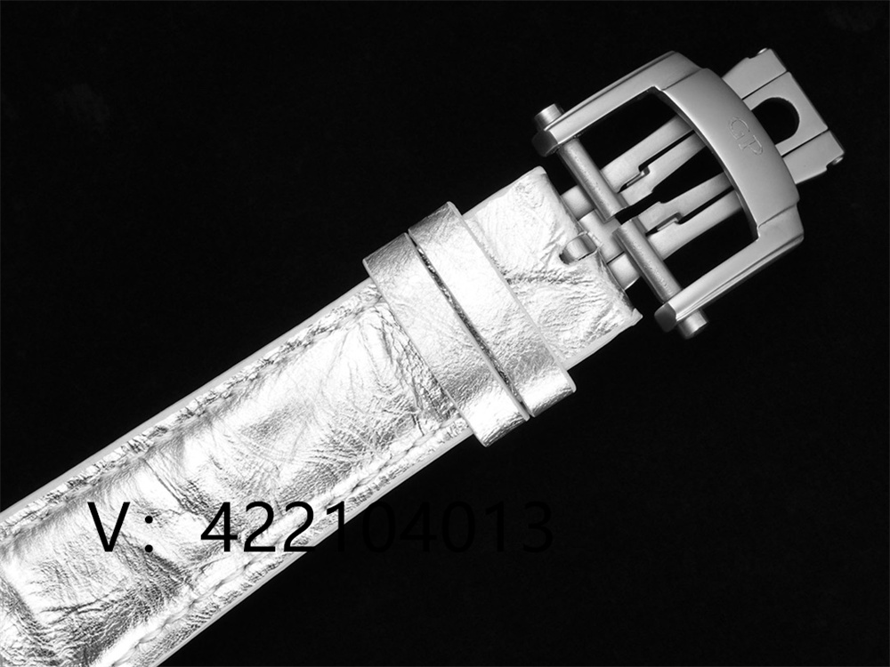 表盘:与镂空机芯一体化处理,透过表壳可以很轻易地看到机芯的各部零件,位于12点方向的发条盒有别于Quasar的镀黑设计,这款除了采用钌金属制作发条盒,还镶了一圈钻石装饰。6点方向的陀飞轮框架採用起源于19世纪的传统七弦琴状设计,除此之外,芝柏表也将自身的的标志设计三金桥融入于机芯结构。